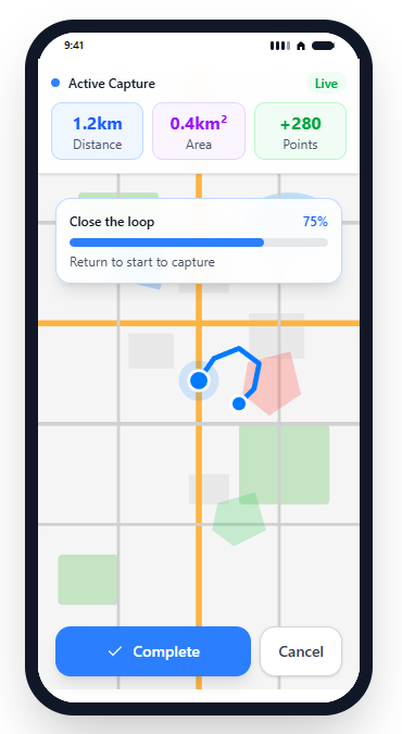 Real-time GPS tracking shows your path on the map. Move in the real world and form a closed loop to capture the enclosed area. Track distance, estimated area, and bonus multipliers.