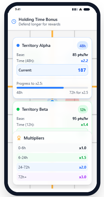 Territories held longer earn increasing multipliers up to 3x. Encourages strategic defense and long-term territorial control. Time-based progression visible on map.