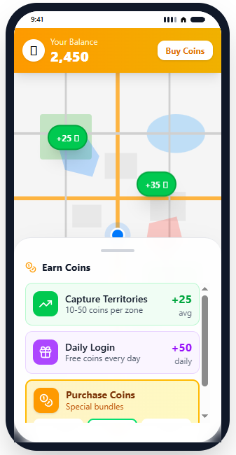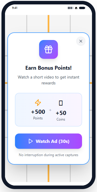 Watch short ads for bonus points and coins. Ad system never interrupts active territory captures. Optional engagement for rewards.