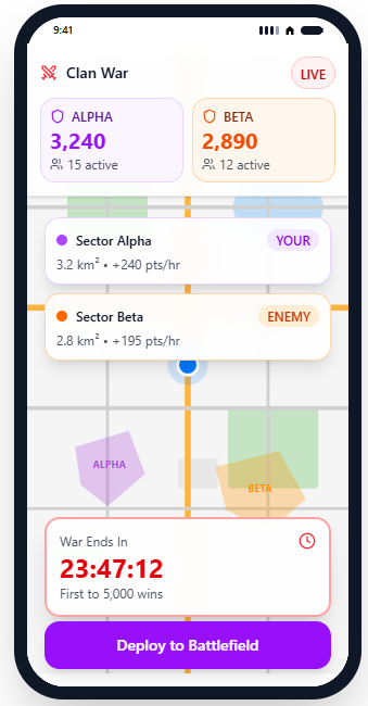 Separate war lobbies for clan battles shown on dedicated maps. Clans can own territories collectively. Real-time point tracking and timed competitive matches.