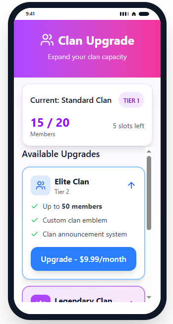 Expand clan capacity from standard 20 members to 50 (Elite) or 100 (Legendary). Larger clans have stronger presence in clan wars. Direct impact on competitive strength.