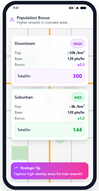 High-density urban areas on the map provide higher long-term rewards. Downtown territories earn up to 2.5x points per hour. Strategic location selection matters.