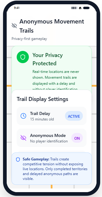Delayed, anonymous movement paths displayed on map. Creates competitive tension without exposing live locations. Privacy-first design principle.