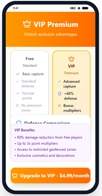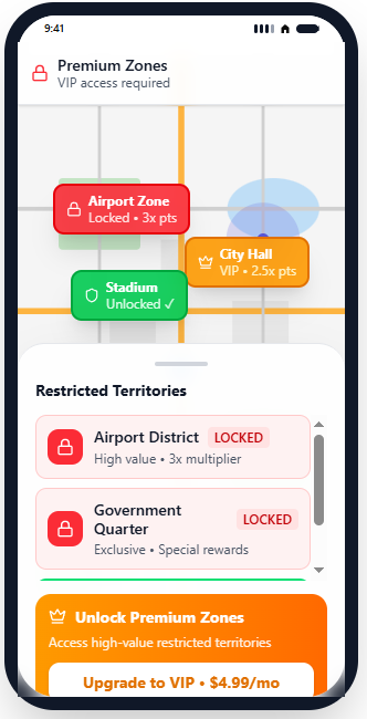 VIP access to restricted high-value zones marked on the map. Premium territories offer exclusive rewards and higher multipliers. Pay-to-access model.
