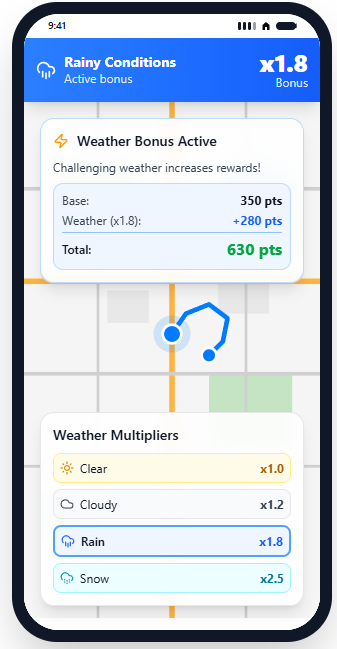 Real-time weather affects scoring on the map. Rain provides 1.8x multiplier, snow 2.5x. Challenging conditions reward brave players with higher points.