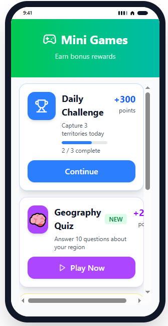 Daily challenges, geography quizzes, login streaks, and lucky spin events. Earn bonus points and cosmetics without territory capture. Retention features.