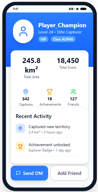 View player stats including total captured area, score, level, and clan affiliation. Send direct messages, add friends, and track achievements.