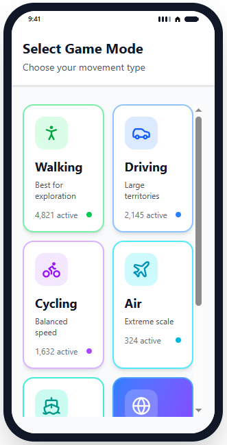 Choose your movement type: Walking, Driving, Cycling, Air, Sea, or All Modes. Each lobby has separate balance rules and scoring systems optimized for that movement type.